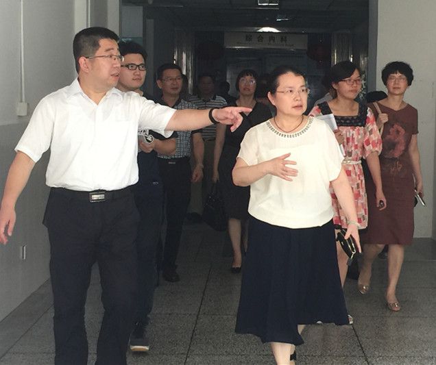 孟主任一行从门诊楼旧门诊大厅沿着医院住院部,一路考察到医院二期综合大楼,并听取了姜燕院长对大楼项目建设、投入使用效果、医院整体运营情况等相关情况汇报。