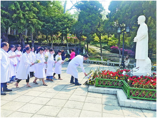 ▲市海沧医院医护代表给林巧稚塑像献花。
