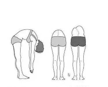 让青少年直腿弯腰至90度,检查者坐于受检者后方,双目平视观察受检者背部。从背部中线切线观察上胸段,胸段,胸腰段及腰段两侧是否等高、对称。