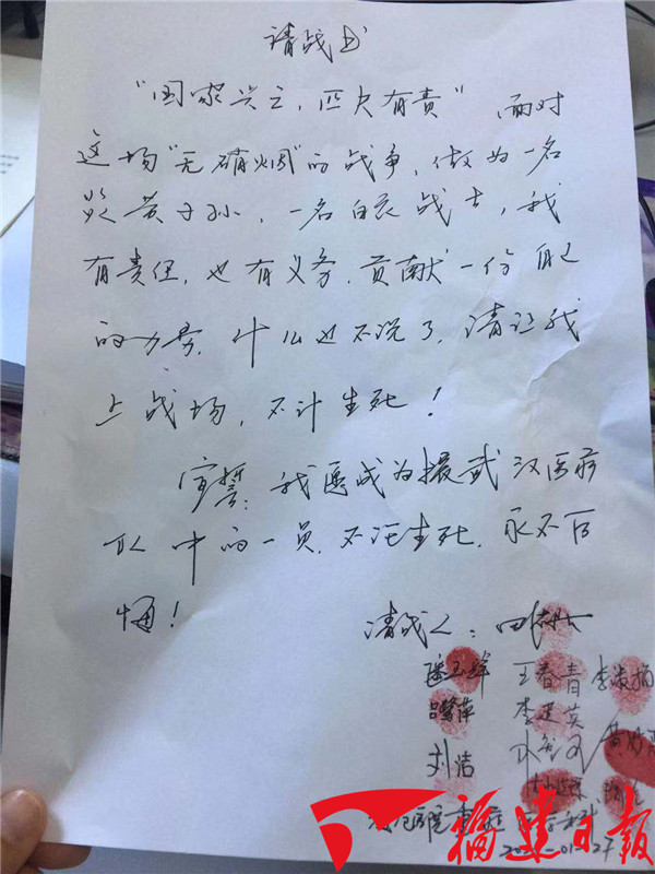 “若有召,召必赴!”43岁的内分泌科副主任医师巫晓强并非党员,专业上也与医院要求的呼吸内科、重症医学科不对口,但收悉院党委的号召后,他不顾家人的担忧,一笔一划写下了力透纸背的请战书。“我不是党员,更要向党员看齐;虽然主攻内分泌专业,但多次在医院急诊、发热门诊工作,在诊治相关疾病有一定经验,若‘战场’上有所需,我必义不容辞。”
