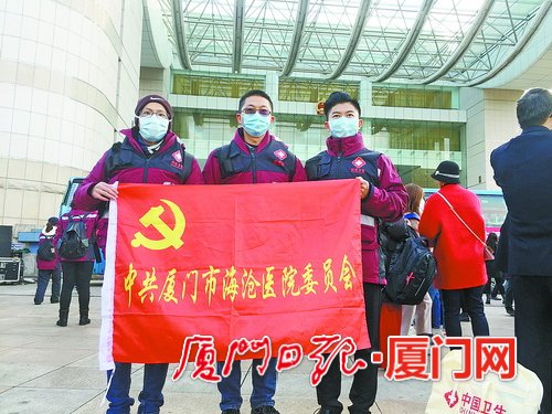 市海沧医院冯水土、肖琦、林勇成为驰援武汉福建医疗队中的一员,图为三位出征武汉的党员医生在出发前合影。