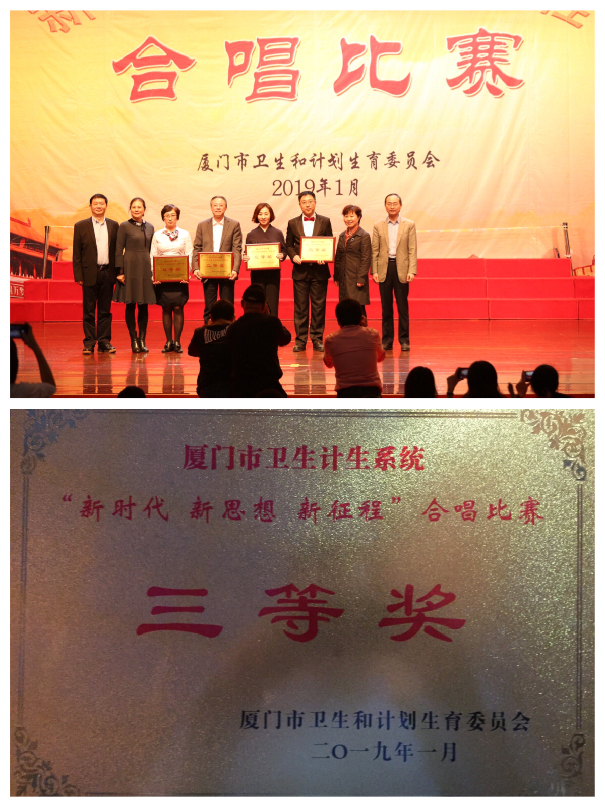 我院由陈长荣、姜燕、庄建民、游立、黄海望和陈毅德等6位院领导班子成员及其他人员组成的展望合唱队,在参加1月12日下午由厦门市卫生和计划生育委员会举办的“新时代 新思想 新征程”合唱比赛中,表现突出,以优异的成绩荣获本次比赛的三等奖。