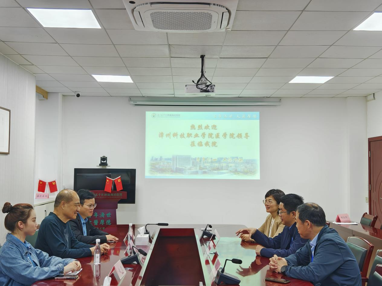 2024年4月9日上午,漳州科技职业学院医学院院长陈玉喜带领学院办公室一行到我院调研,蔡成福院长、李超副院长及相关职能科室主任参加调研。